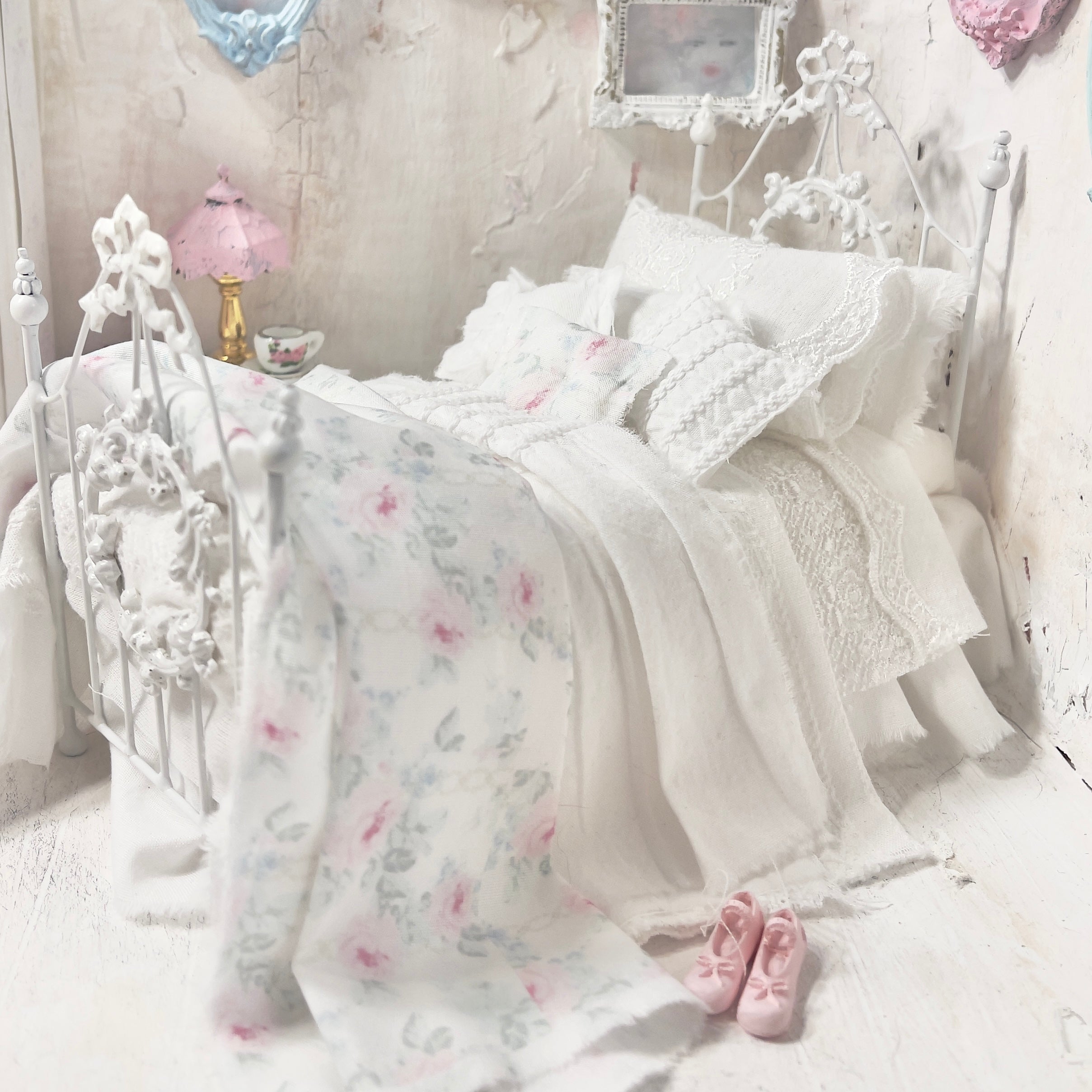 Our little world of romantic dollhouse dreams is expanding as I am growing my Dressed Bed Collection — each piece in this collection is one of a kind, romantic miniature lovingly layered in soft fabrics, ruffles, lace, and charm, ready to slip right into your dollhouse.