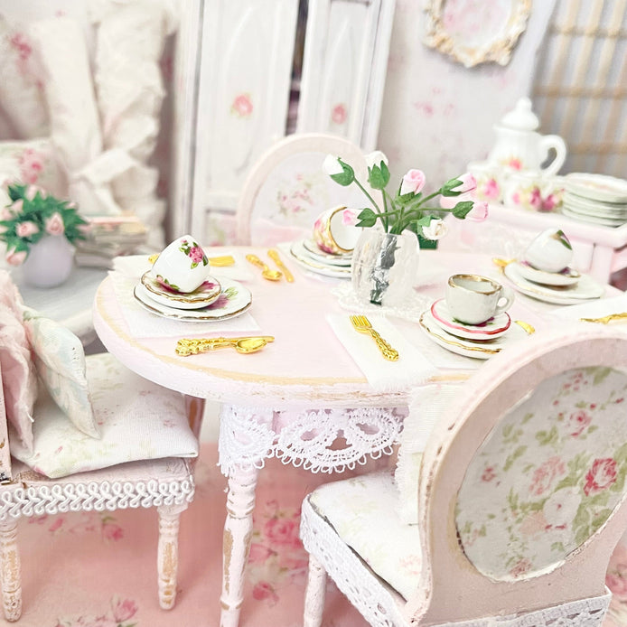 From dainty side tables… chairs… dining sets…stuffed armoires… dressed mannequins to timeworn settees, this collection celebrates the poetry of peeling paint and petal-soft romance, perfectly sized for miniature 1:12 scale daydreams.