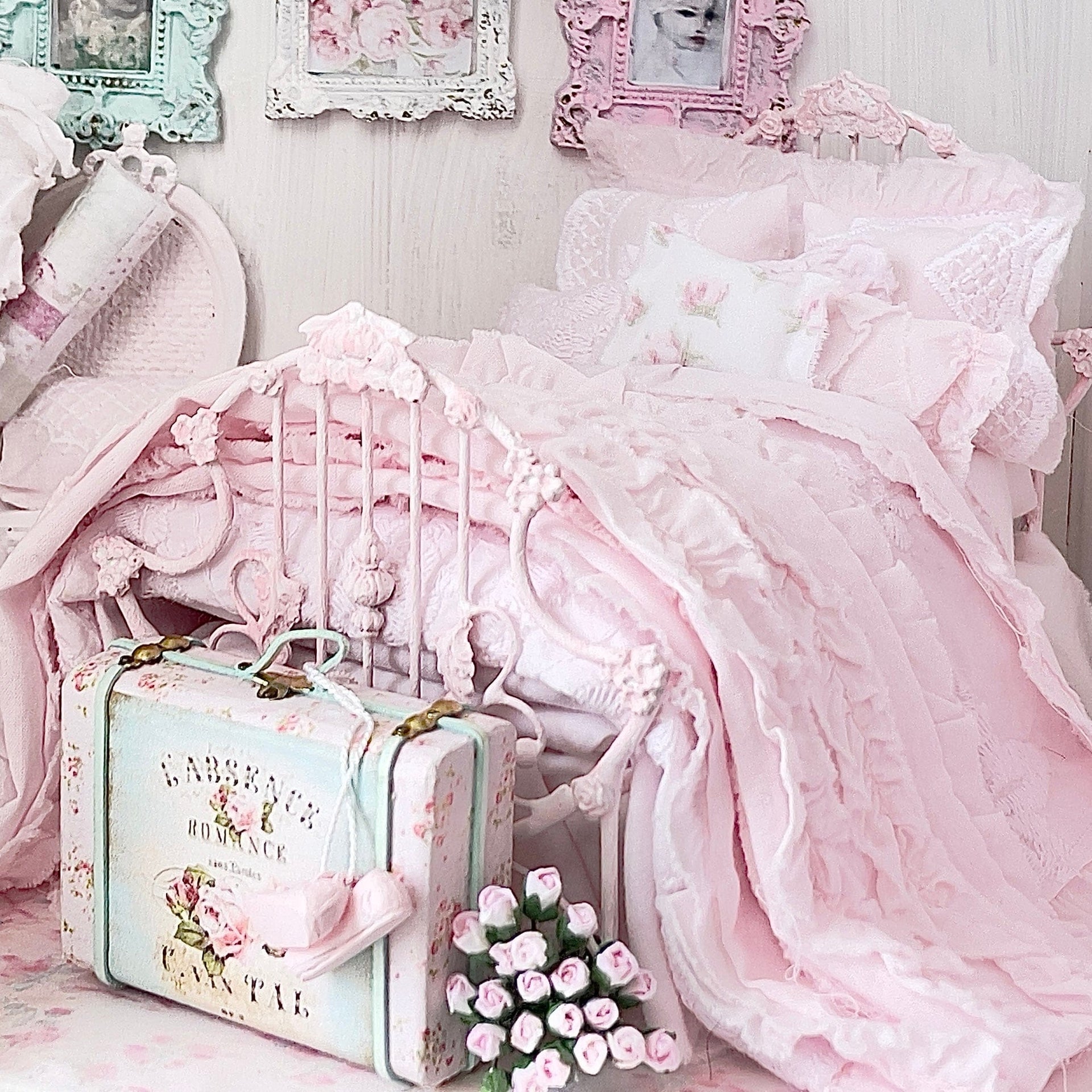 Forever in Bloom 1:12 scale bedding sets are the quiet classics of my shabby romantic world of Whispered Moments...styles that have captured so many hearts that they remain lovingly available in Chantallena Doll House’s story. Each set is handcrafted with layered fabrics, faded florals, gathered ruffles, and the soft poetry of well-loved linens. These are the designs that customers ask for by name, the ones that seem to live forever in little bedrooms, adding a touch of gentle romance to every miniature dollhouse they grace.