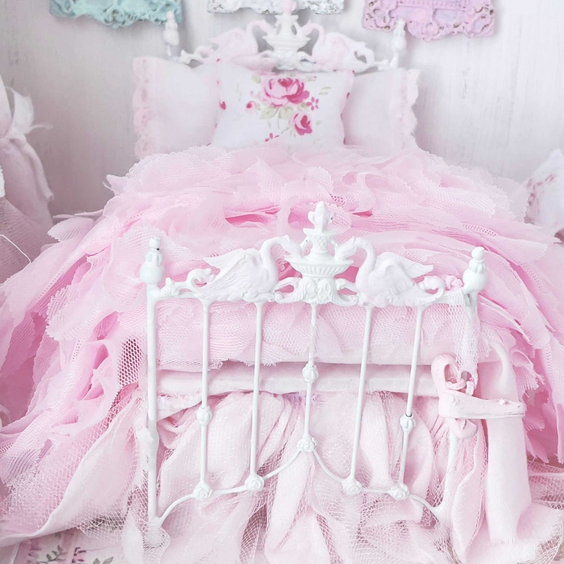 From Chantallena Doll House comes Six Whispering Petals — a collection of 1:12 scale miniature dollhouse beds, dressed in layers of faded florals, signature cotton ruffles, lace and shabby fabric… each one a quiet bloom of handcrafted romance. Other petals also reside in the garden….perhaps, painted armoires- overflowing with shabby linens…comfy white cotton sofas with overstuffed cushions…billowy ruffled curtains for that enchanting view…floral cotton bedding sets or romantic beds left bare…with stories yet to be told.