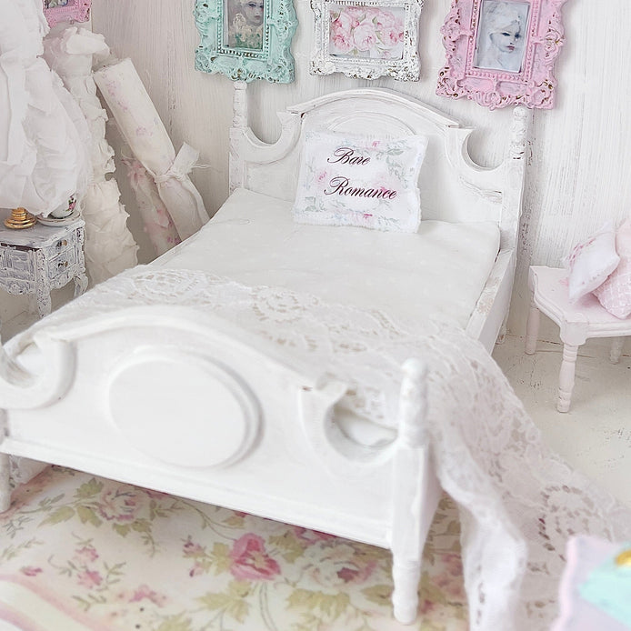 Each 1:12 scale dollhouse miniature bed carries the quiet beauty of chipped paint and gentle aging, as if it has already lived a life in a sunlit cottage. Left undressed by design, these beds invite collectors to layer their own Forever in Bloom linens, charming ruffled comforters and whispered moments over time.