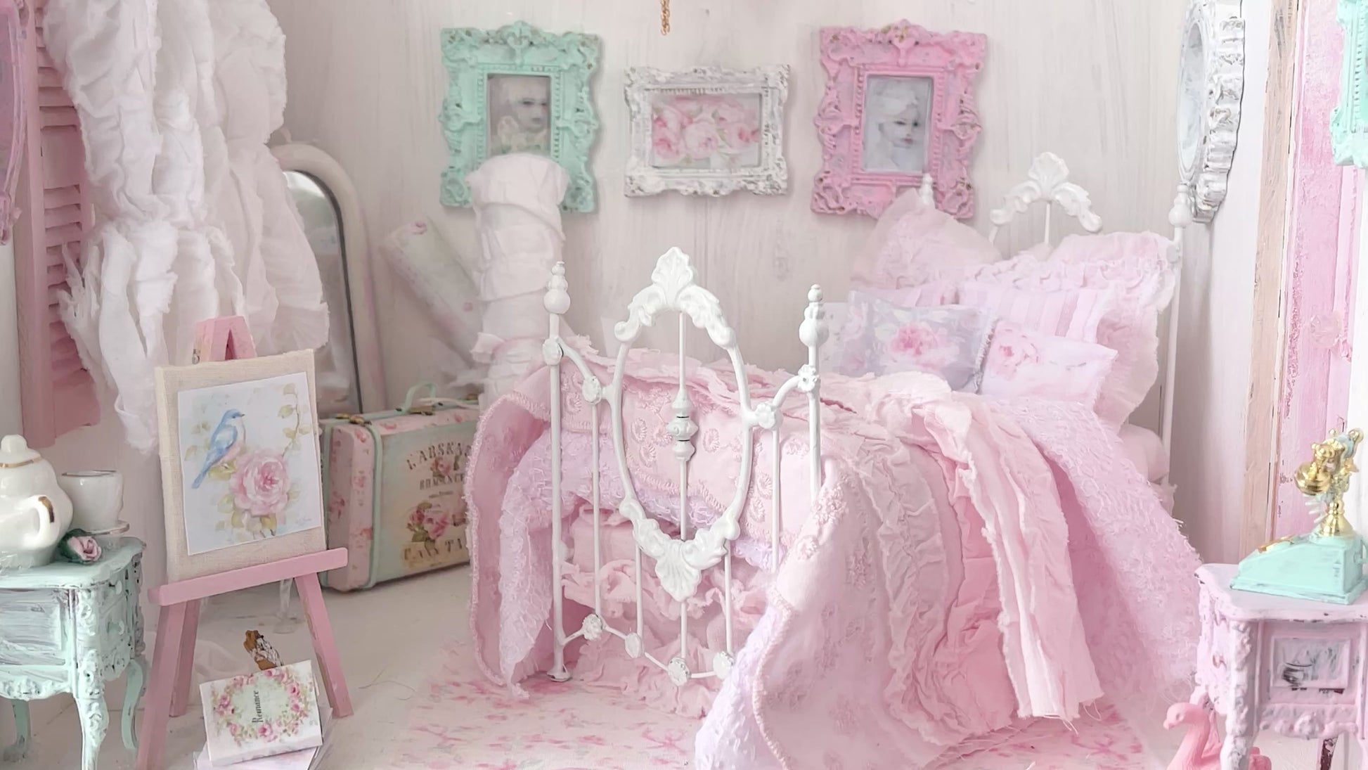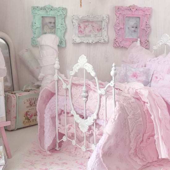 A twin-size wrought iron bed is softly dressed in layers of shabby pink cotton. The ruffled two tier pink cotton bed skirt gently sweeps the floor… A pale pink cotton lawn sheet peeks through, finished with a whisper of ruffle trim, adding quiet sweetness beneath the two embroidered bedspread, bed runner and ruffled bed throw. Six assorted feminine pillows—each a little different, some with roses, rest together like treasures, creating a bed that feels lovingly collected, tender, and full of storybook charm.