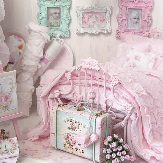 Lyrical Roses is a lovely 1:12 Scale Single/Twin Wrought Iron Metal Bed by Lindy Wright, Painted Pale Pink with handcrafted bedding by Chantallena Doll House. Only 1 available.