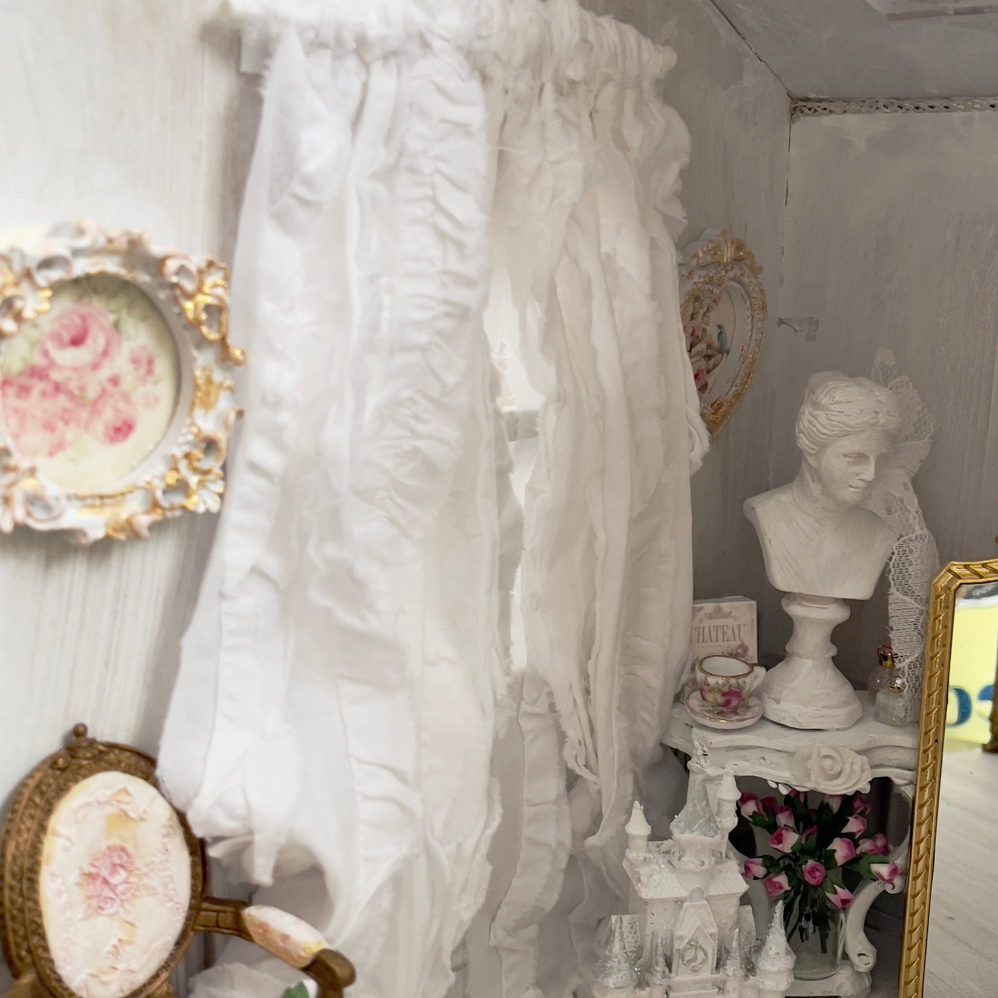 Enhance your 1:12 miniature dollhouse, room box or diorama with soft and stylish cotton, linen or silk curtains. These versatile designs offer an airy aesthetic perfect for complementing many bedroom styles, all with the quality of design and construction you expect from Chantallena Doll House.