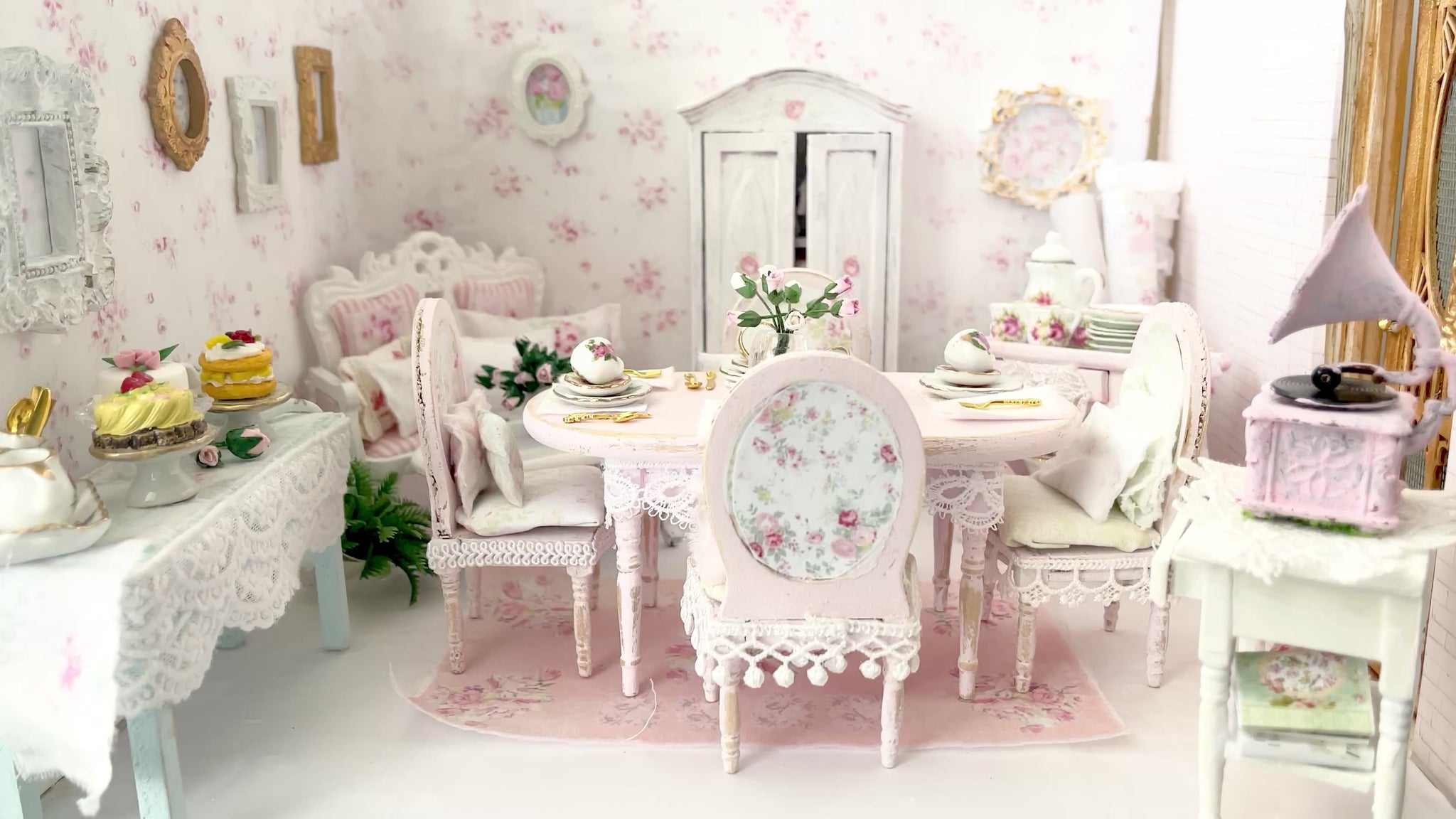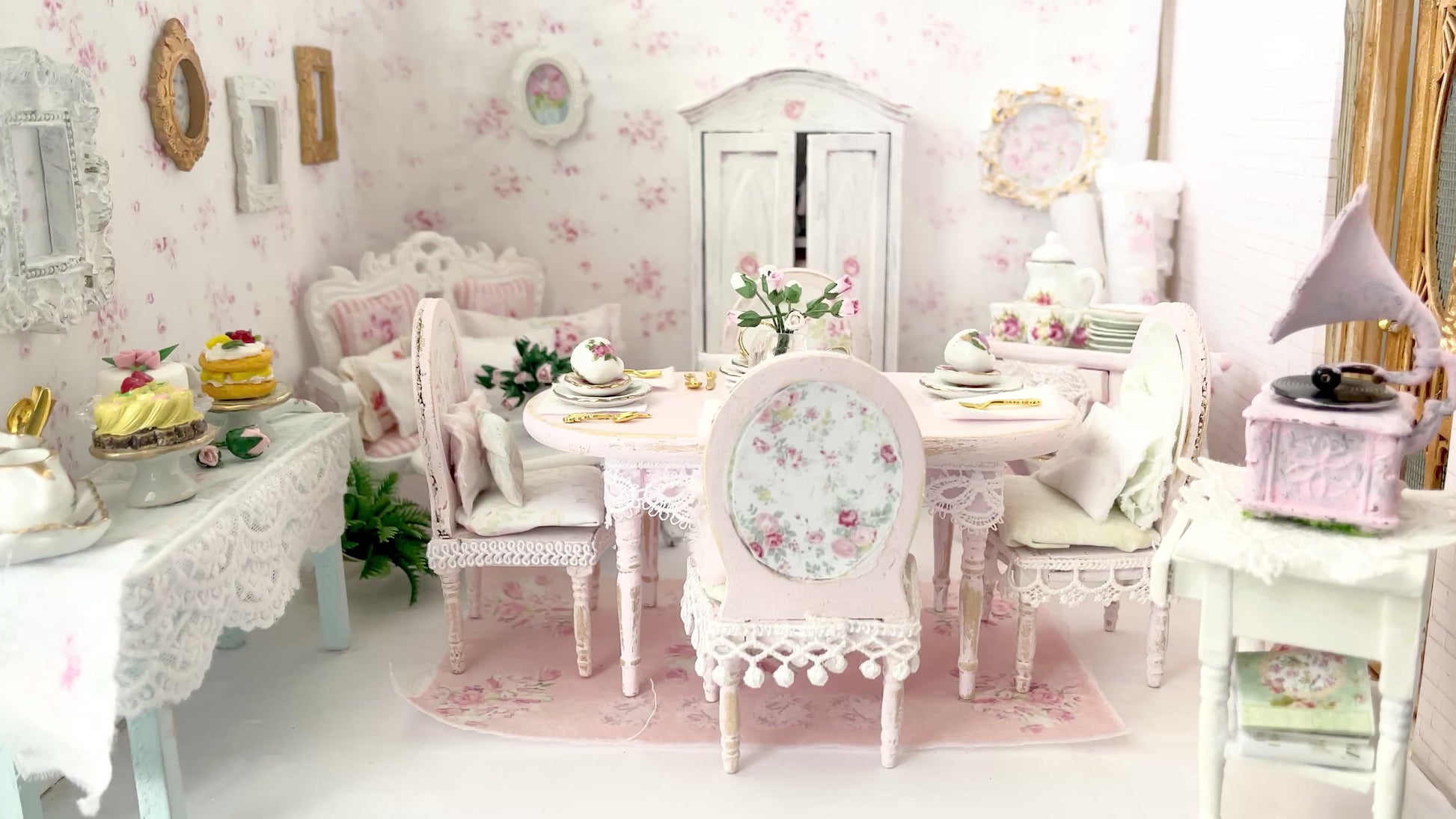 Shabby Distressed Pink Dining Table Set with Four Chairs, Pillows, White Doily and Pink Roses Centerpiece, gold tone tableware, placemats, napkins, with the added charm of mixed-matched china from Chantallena Doll House. So pretty.