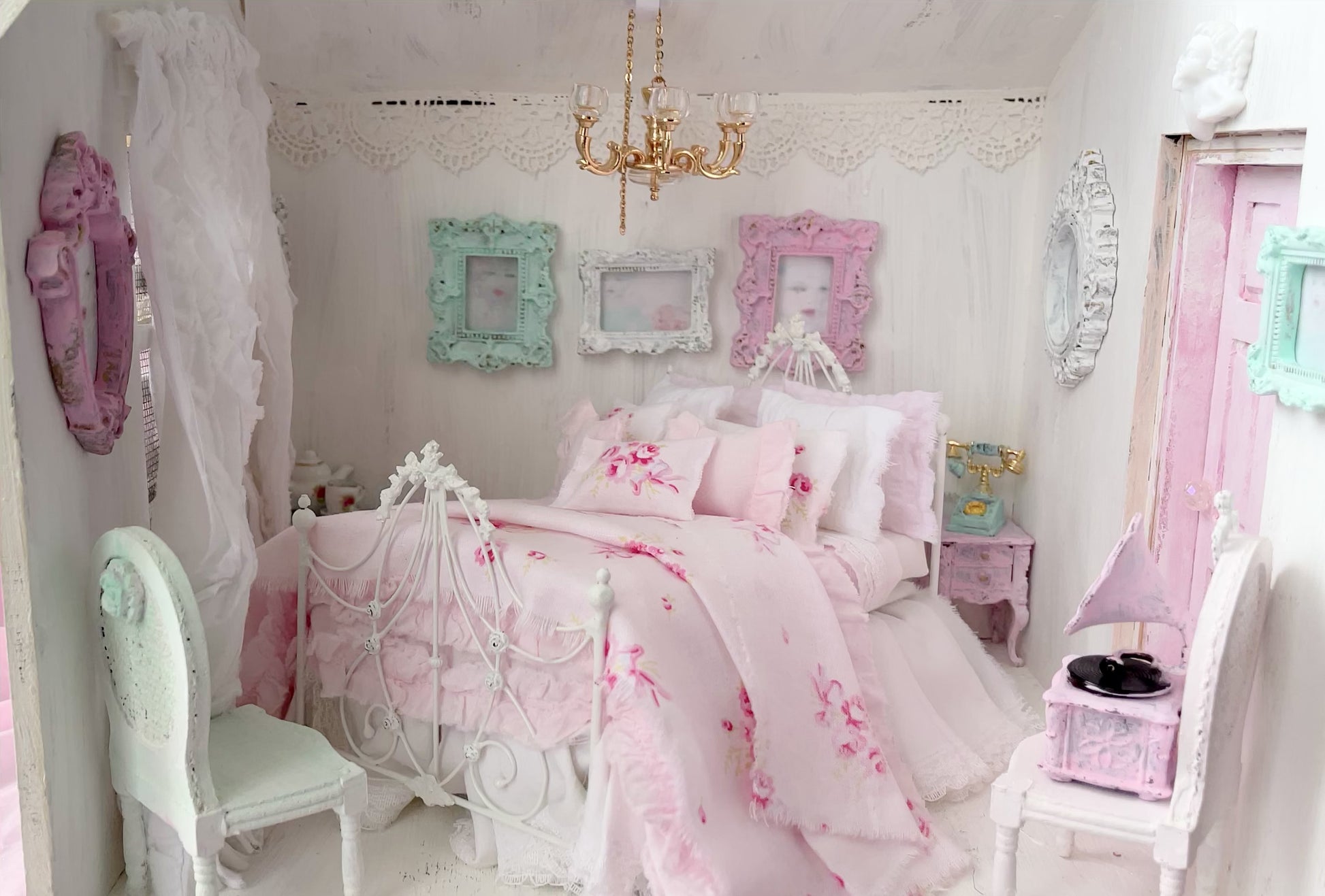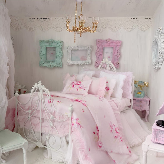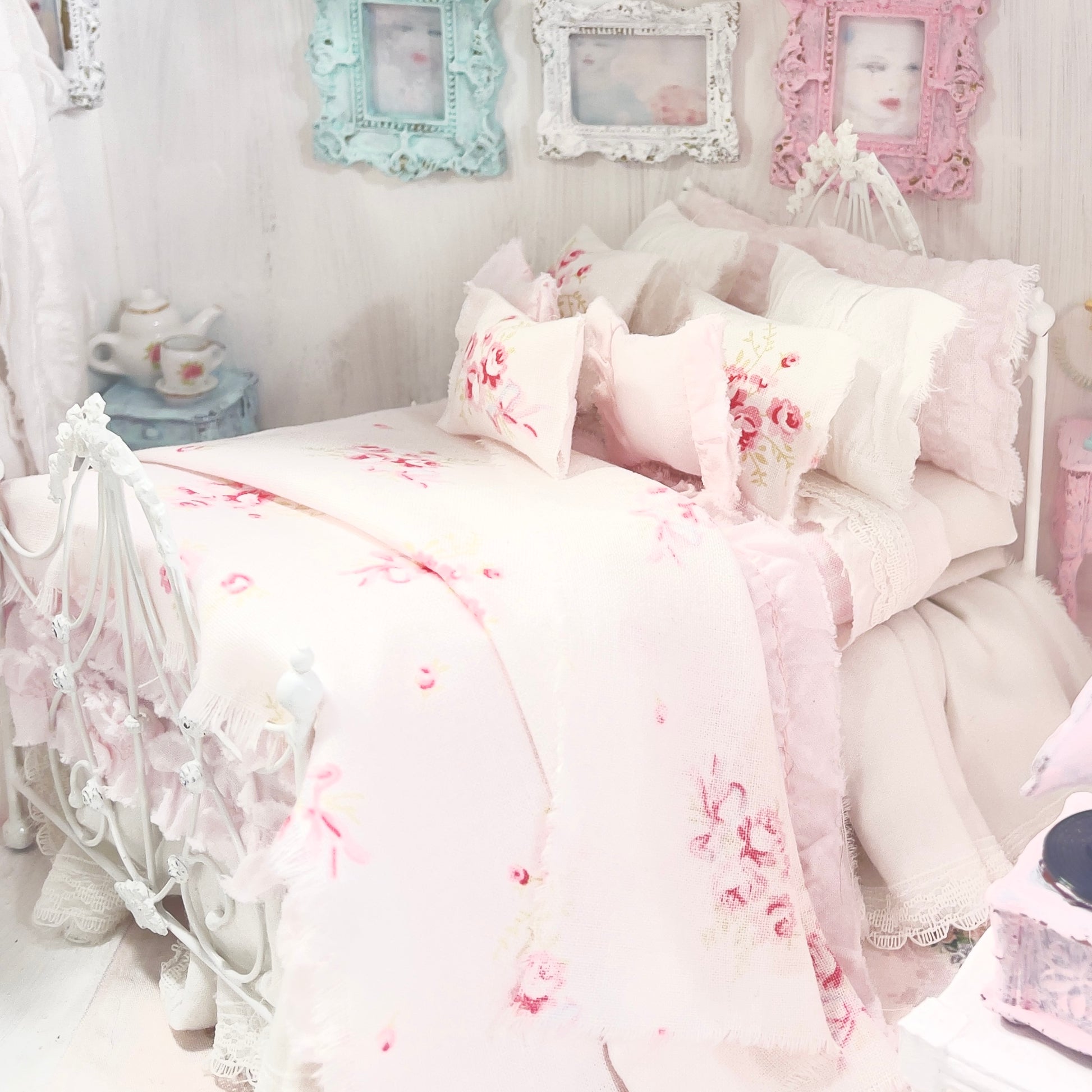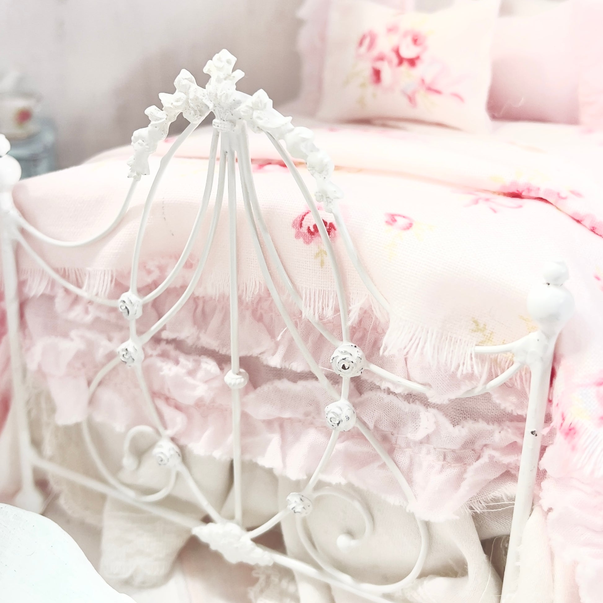 Dressed 1:12 Scale Bed | White and Pink Shabby Roses with Pink Ruffled Bedspread| All About the Roses