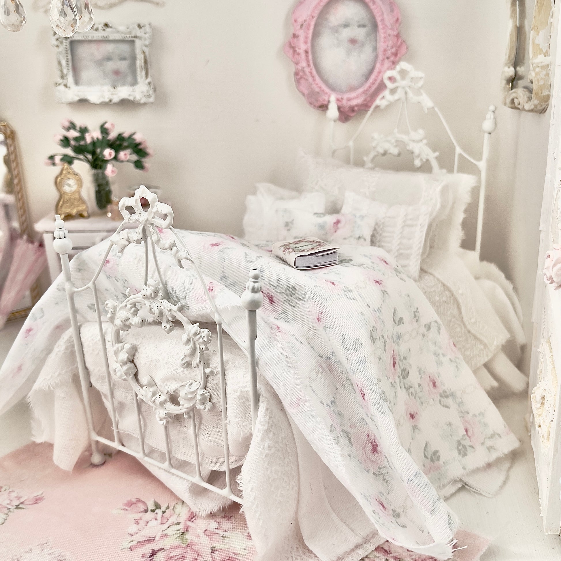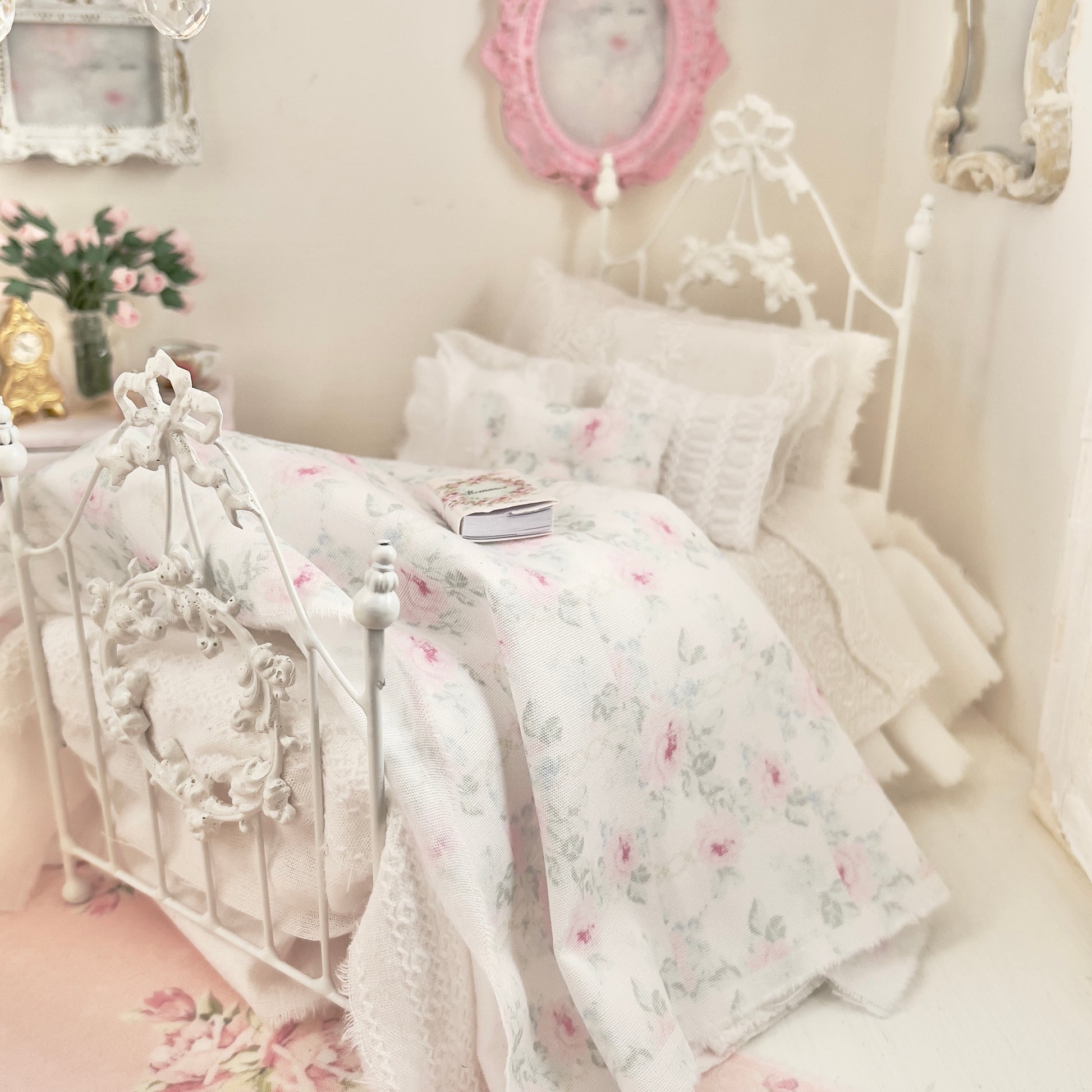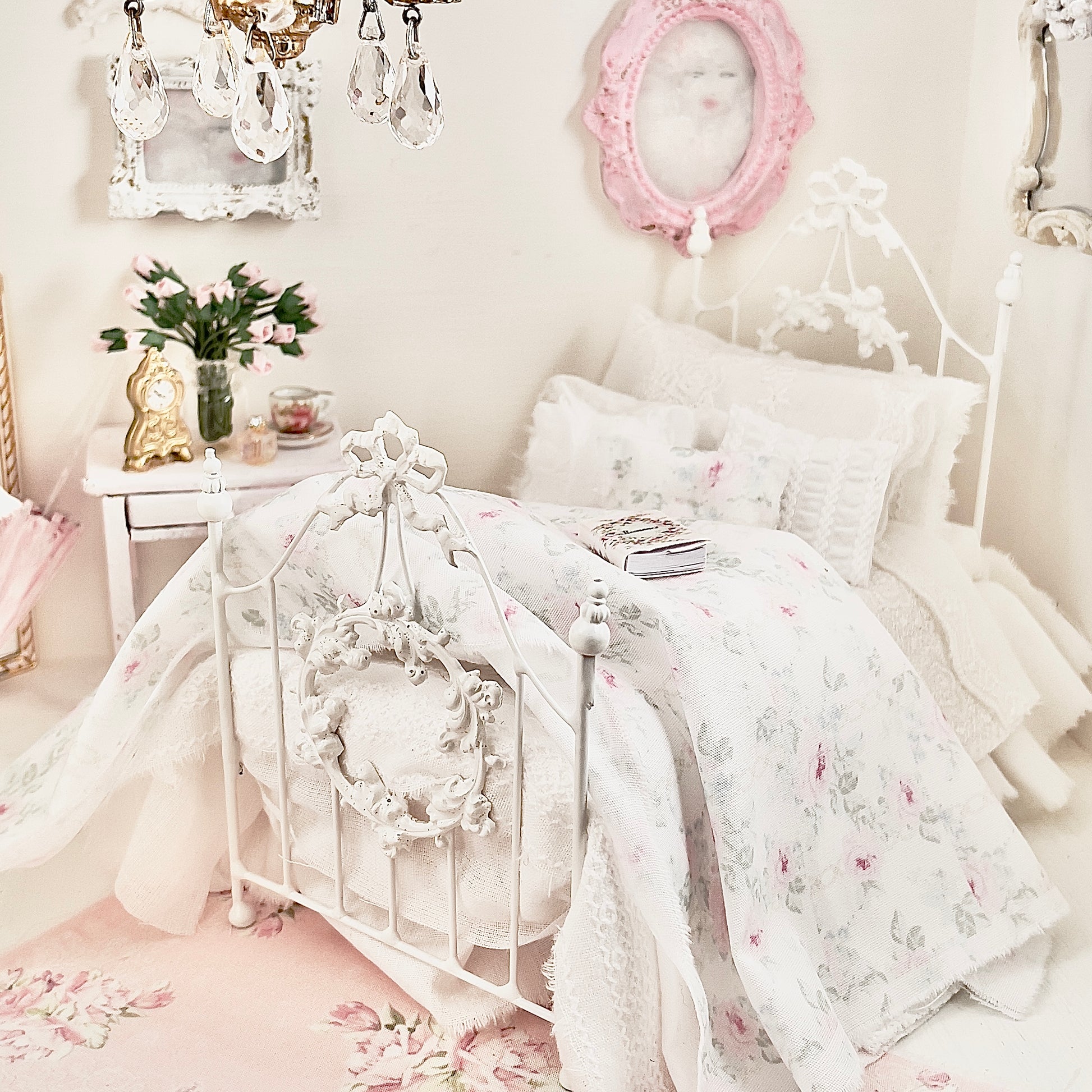 Embroidered Rose is a 1:12 Scale White Wire Metal Twin Bed Dressed in a White Embroidered Cotton Lawn with Shabby Pink Roses with Blue Floral Throw from Chantallena Doll House. Only 1 available. The lovely bed is from Summerhill Studio (formerly Tiny Irons Miniatures). This dressed bed features: