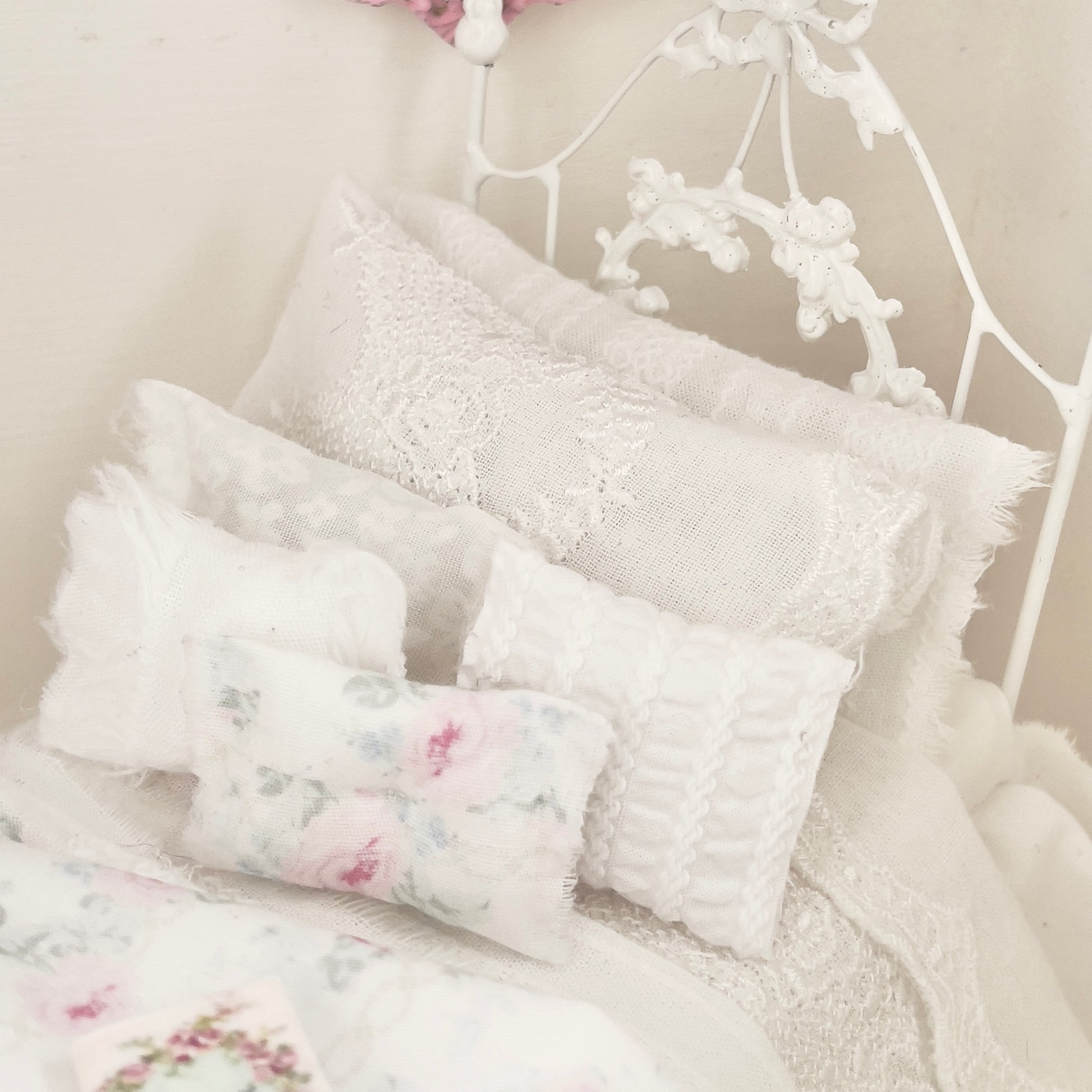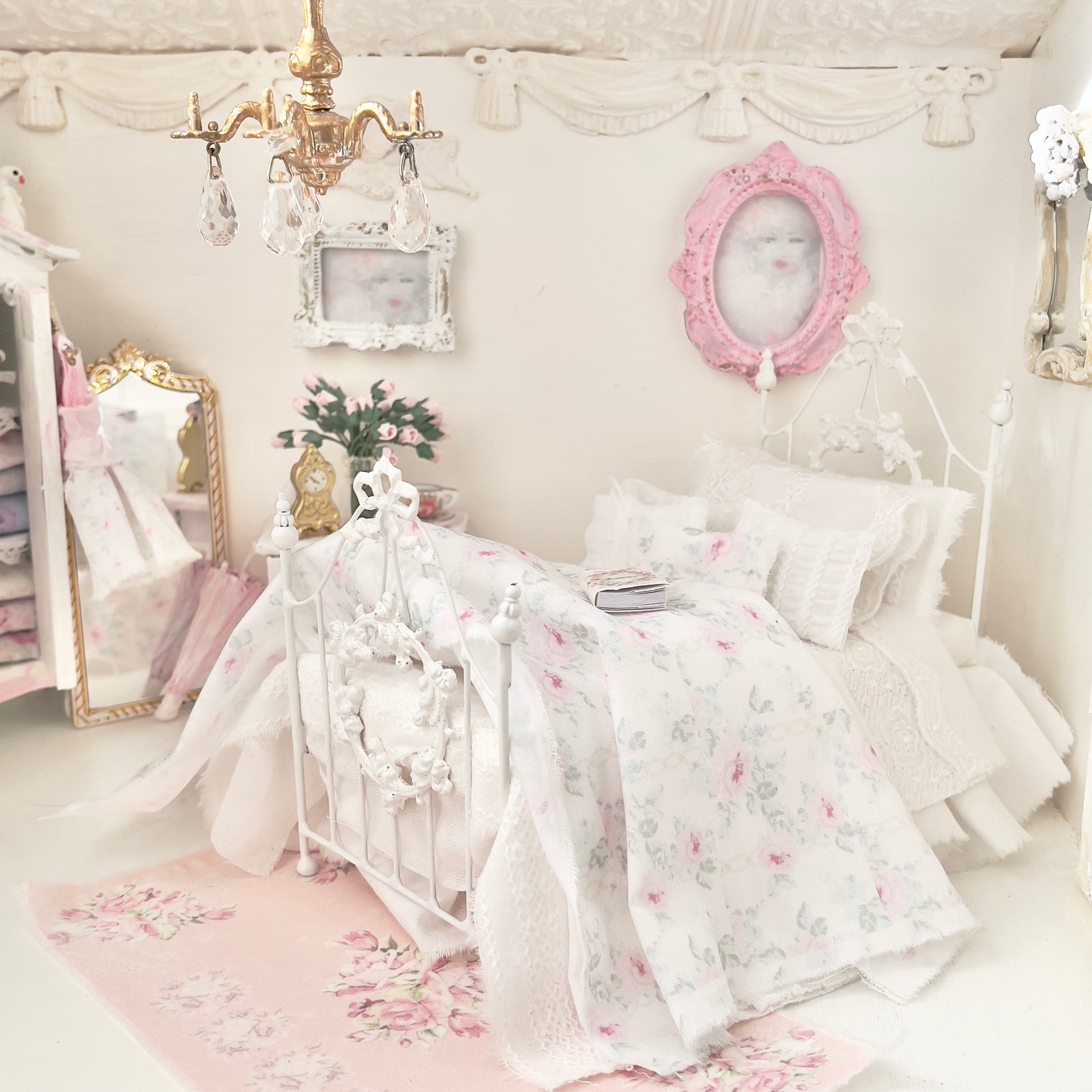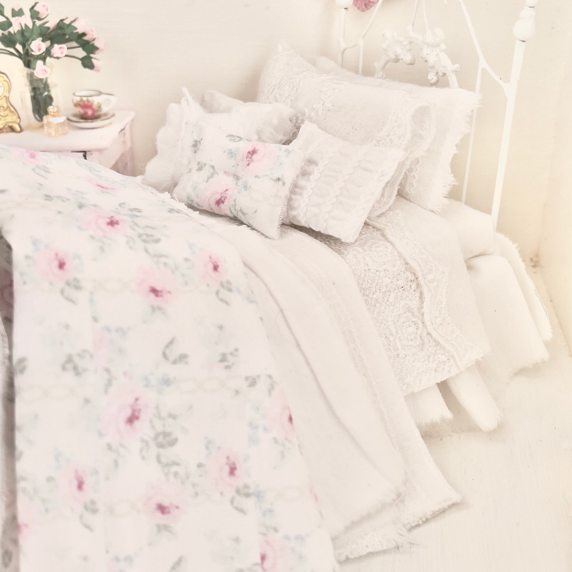 Embroidered Rose is a 1:12 Scale White Wire Metal Twin Bed Dressed in a White Embroidered Cotton Lawn with Shabby Pink Roses with Blue Floral Throw from Chantallena Doll House. Only 1 available. The lovely bed is from Summerhill Studio (formerly Tiny Irons Miniatures). This dressed bed features: