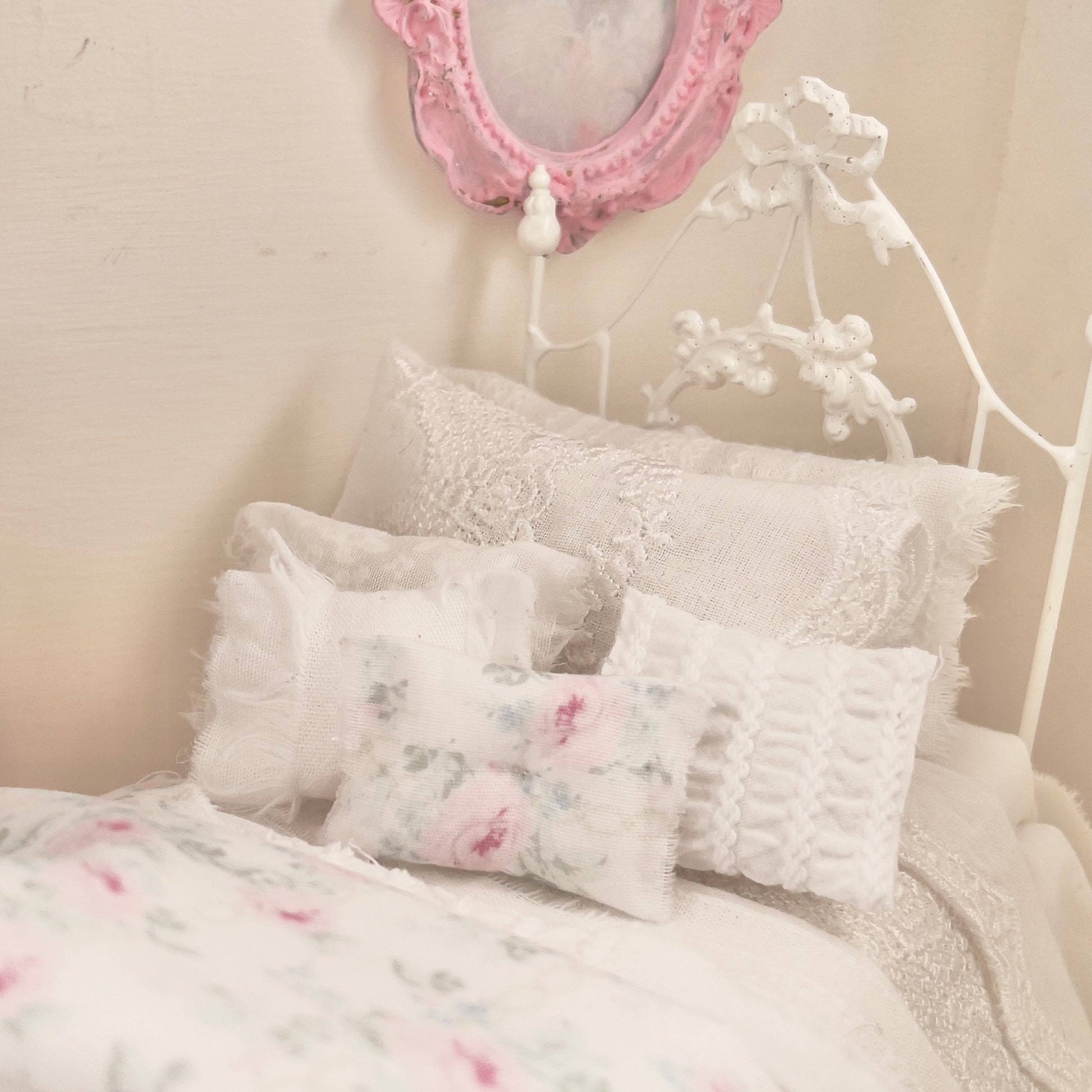Dressed 1:12 Scale Bed | White Embroidered Cotton with Blue and Pink Shabby |Embroidered Rose