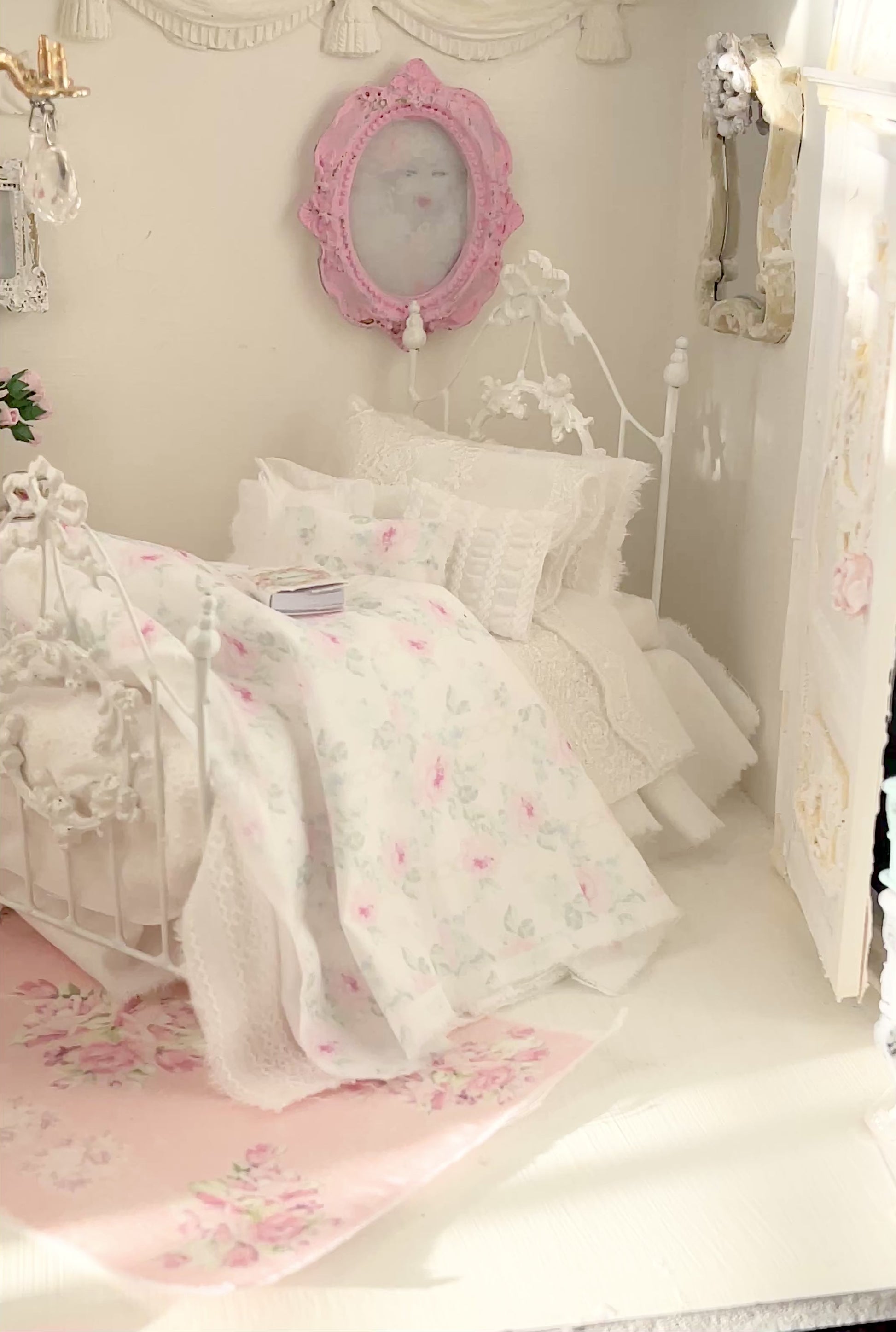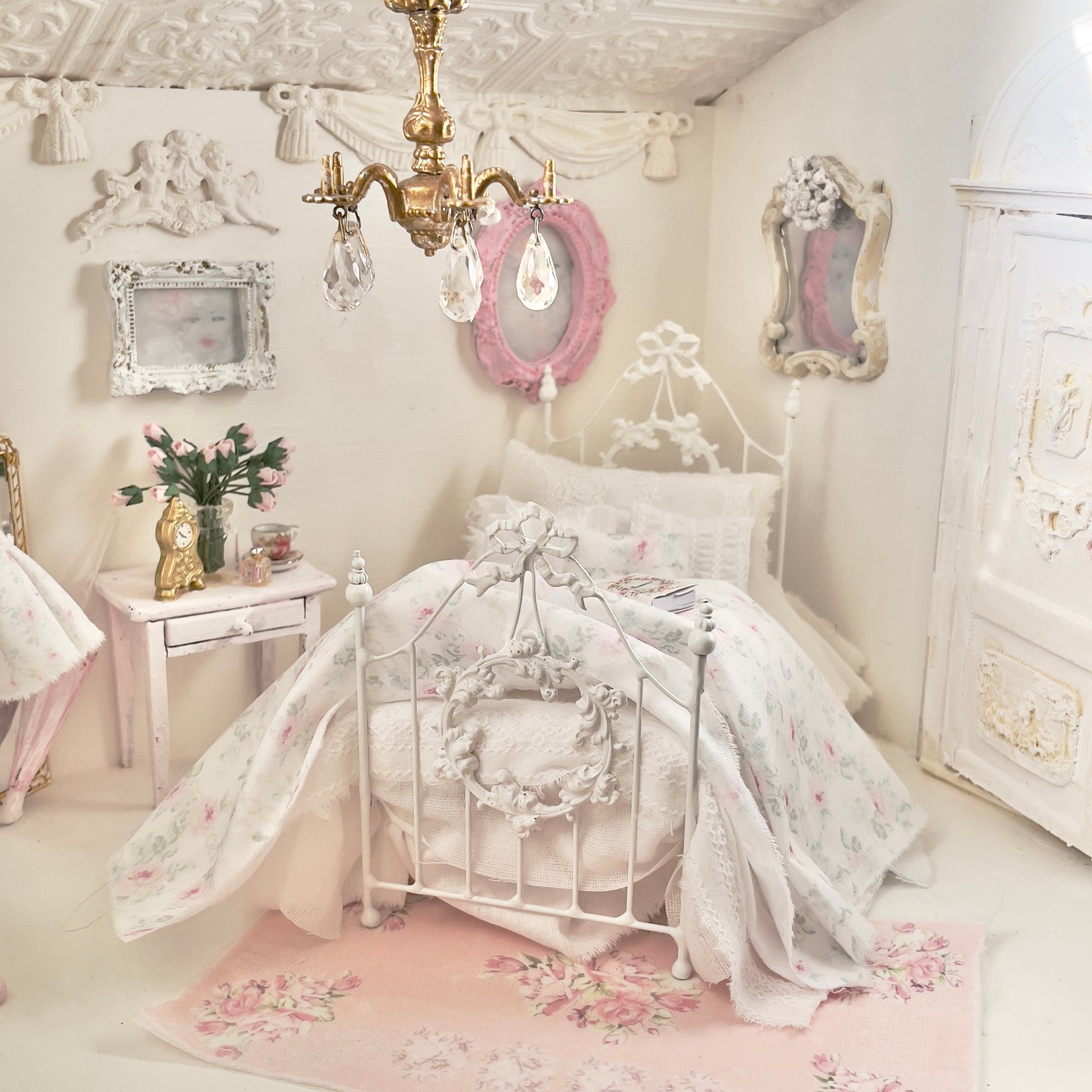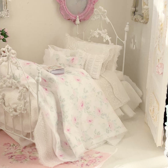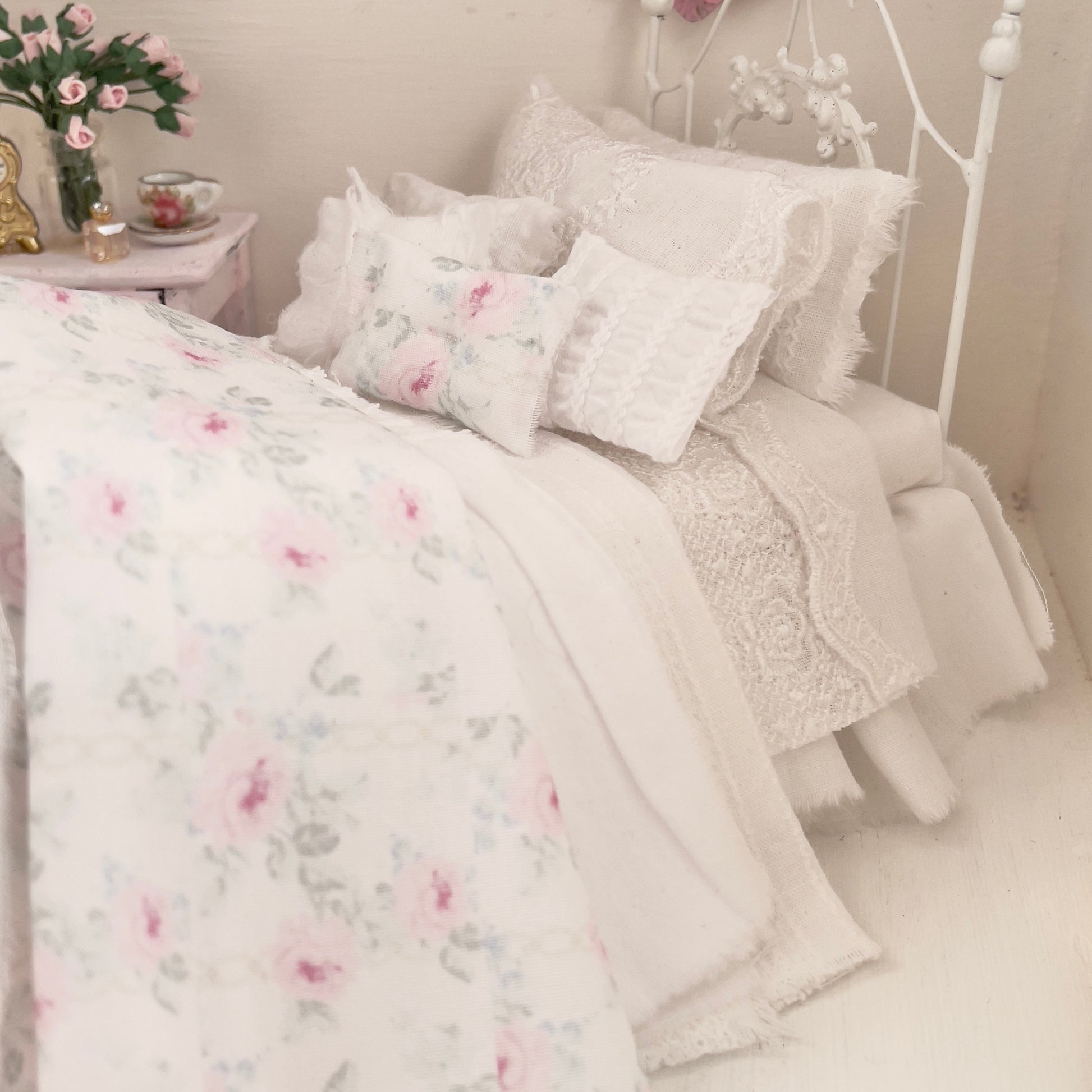 Embroidered Rose is a 1:12 Scale White Wire Metal Twin Bed Dressed in a White Embroidered Cotton Lawn with Shabby Pink Roses with Blue Floral Throw from Chantallena Doll House. Only 1 available. The lovely bed is from Summerhill Studio (formerly Tiny Irons Miniatures). This dressed bed features:
