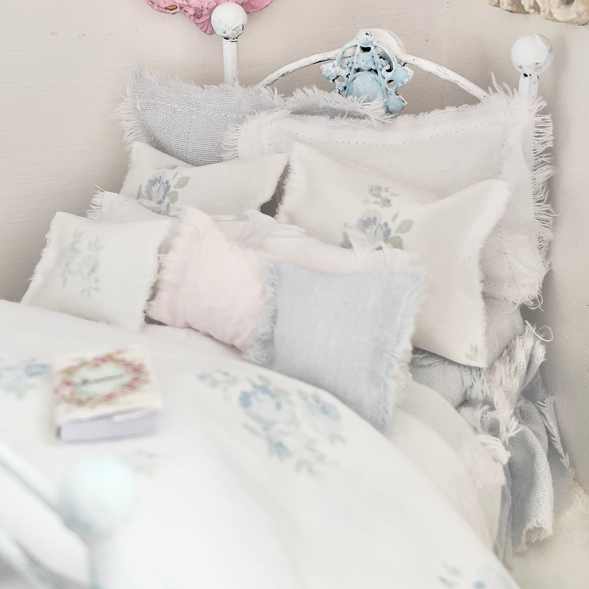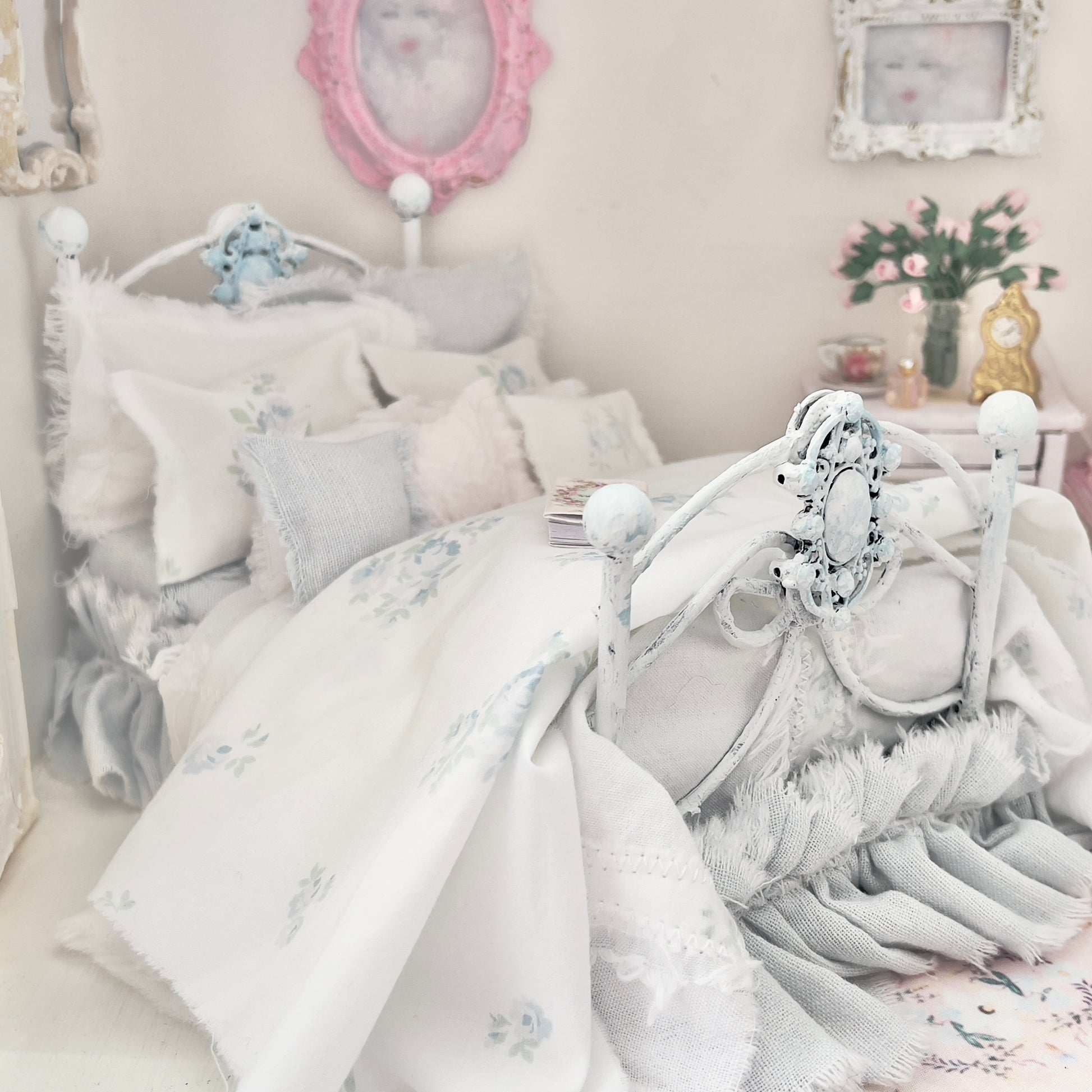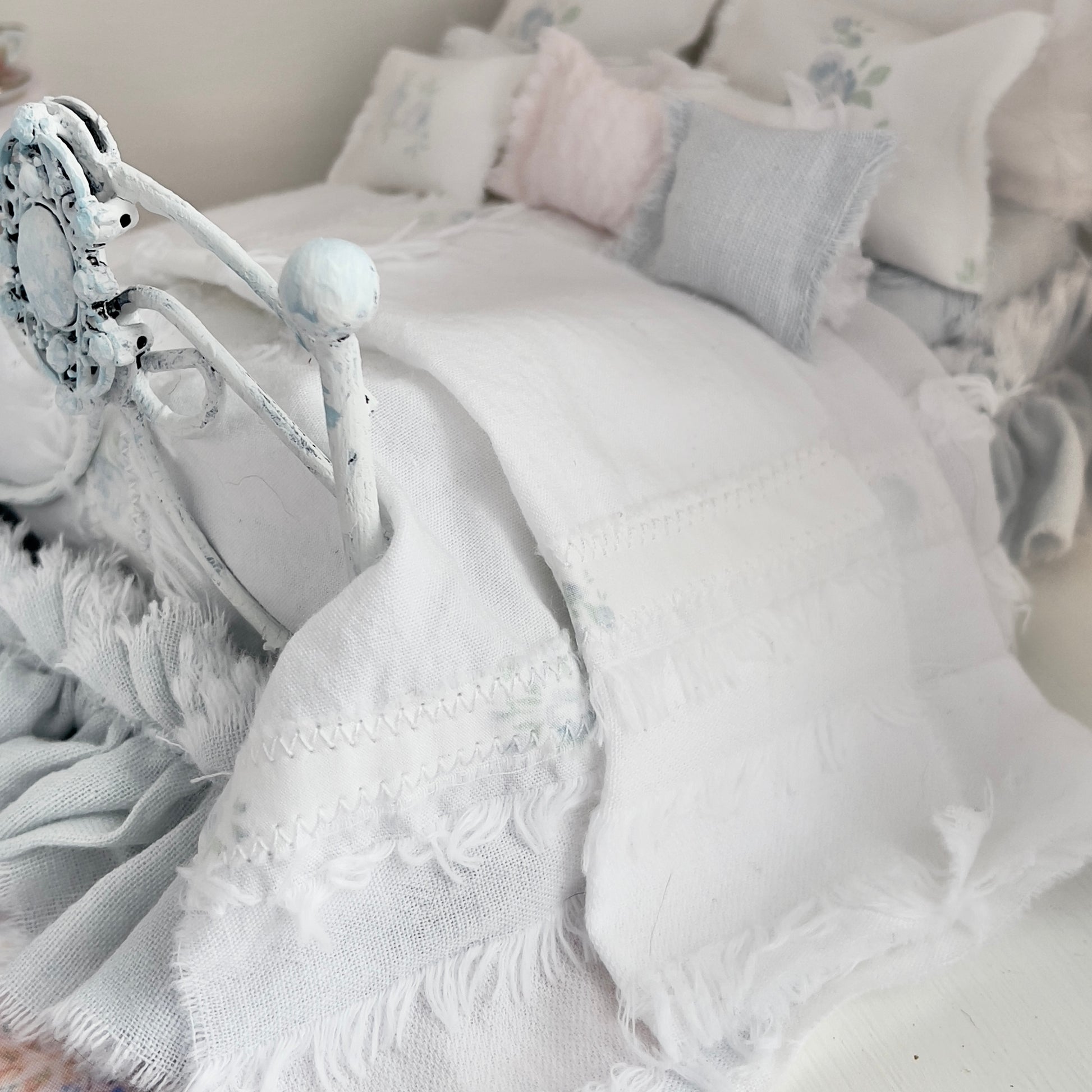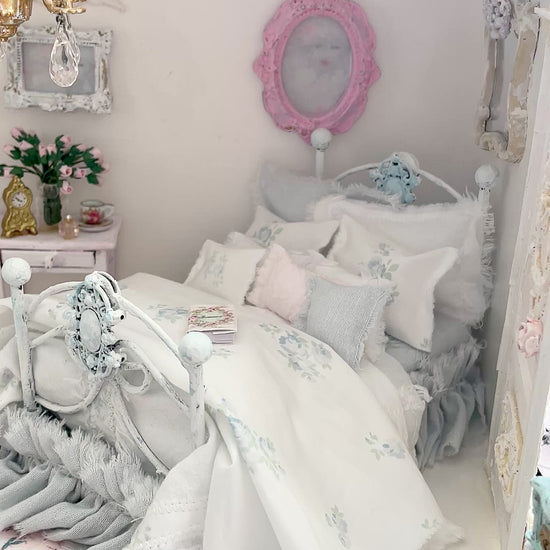 Dressed 1:12 Scale Bed | Pale Blue and White Linen/ Cotton with Blue Roses| Blue Rose Fringe