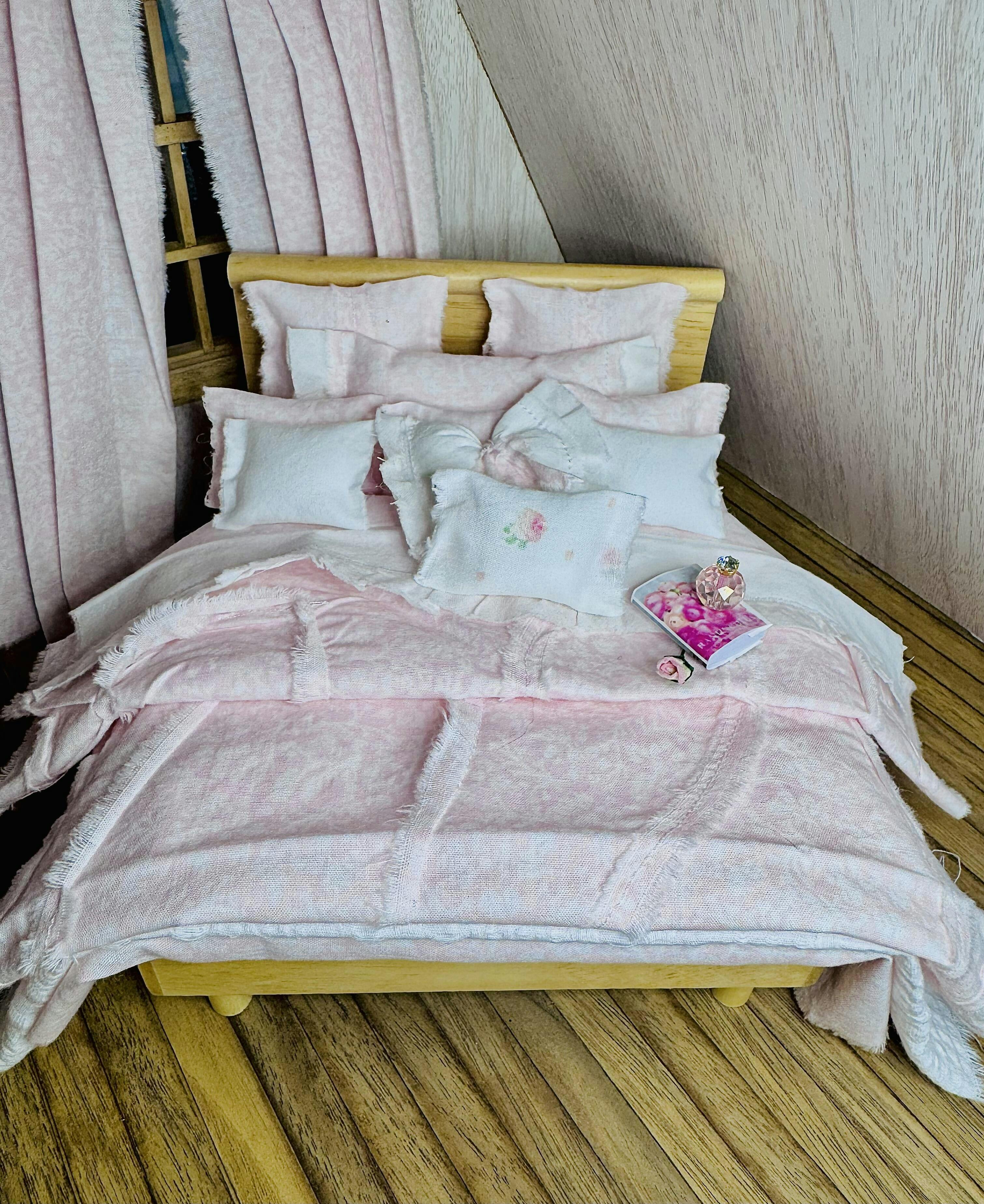 This Cotton Bedding Set of Pink and White Toile Contains Ten Pieces for a Single/Twin or Double/Full 1:12 Scale Bed. Bedding only. Bed and accessories are not included.